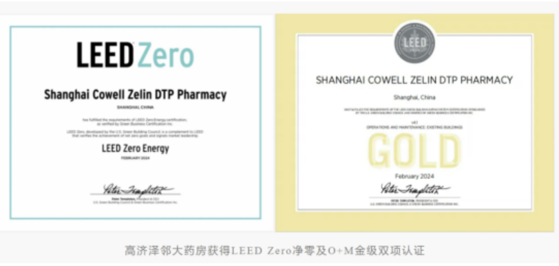 2024年2月,高济泽邻大药房取得LEED O+M(建筑运营与诊治)金级及LEED Zero净零双认证,并成为全球第一个取得LEED Zero净零认证的药房零卖空间。这一荣誉是对高济健康积极承担社会背负、股东绿色发展所作念奋发的高度招供和确定,亦然高济健康ESG说念路上的迫切里程碑。